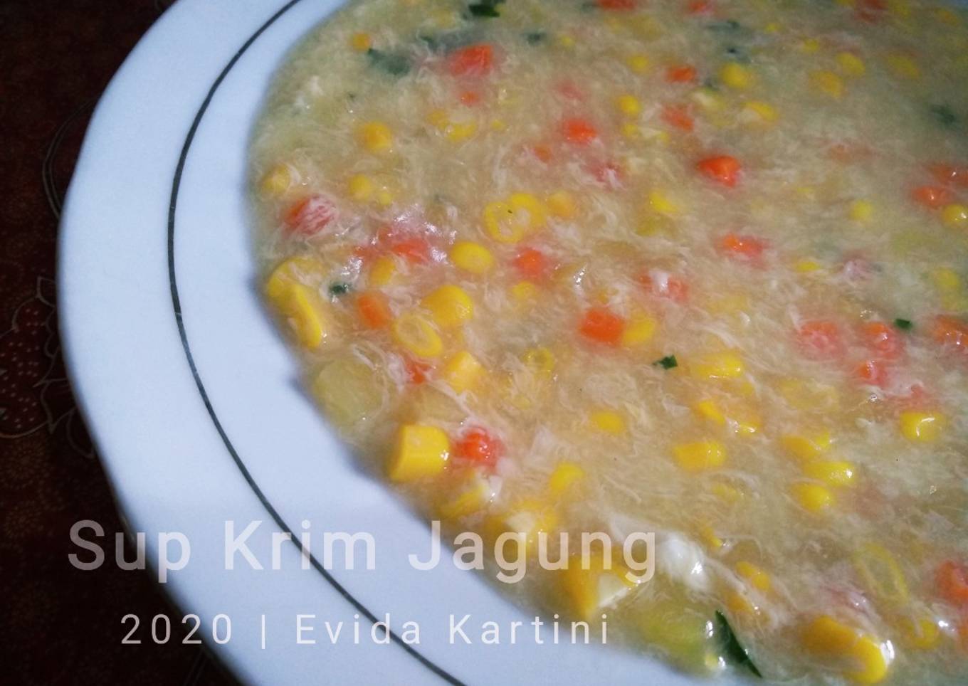 - Siapkan bahan-bahannya. Campur sup krim jagung sachet dengan 500 ml air. Aduk rata dan jangan sampai ada gerinjilan. Masukkan potongan kentang, wortel, dan pipilan jagung. Aduk rata sampai mendidih dan sayuran agak lunak. Setelah itu sambil terus diaduk, masukkan kocokan telur, aduk rata. Terakhir masukkan cairan tepung terigu, aduk rata sampai kuah mengental dan mendidih. Matikan api.